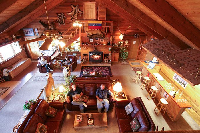 The Angry Eagle Lodge is constructed of cedar logs and features six private bedrooms—four of which have two queen beds, and the other two rooms each have a queen bed and two full beds. Each bedroom also has a private bathroom and shower. It accommodates groups of 12 to 14 people per week and includes satellite TV and Wi-Fi.