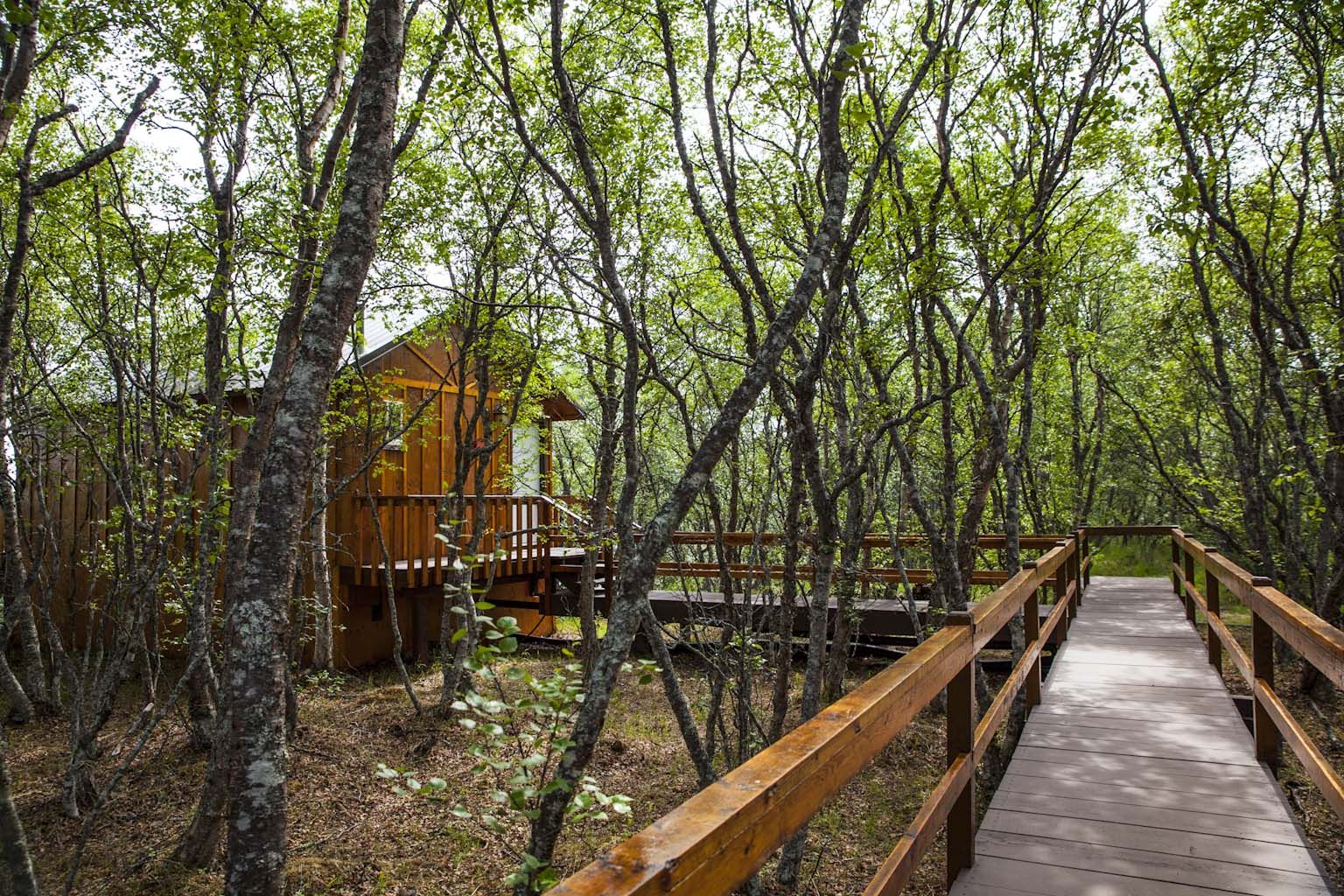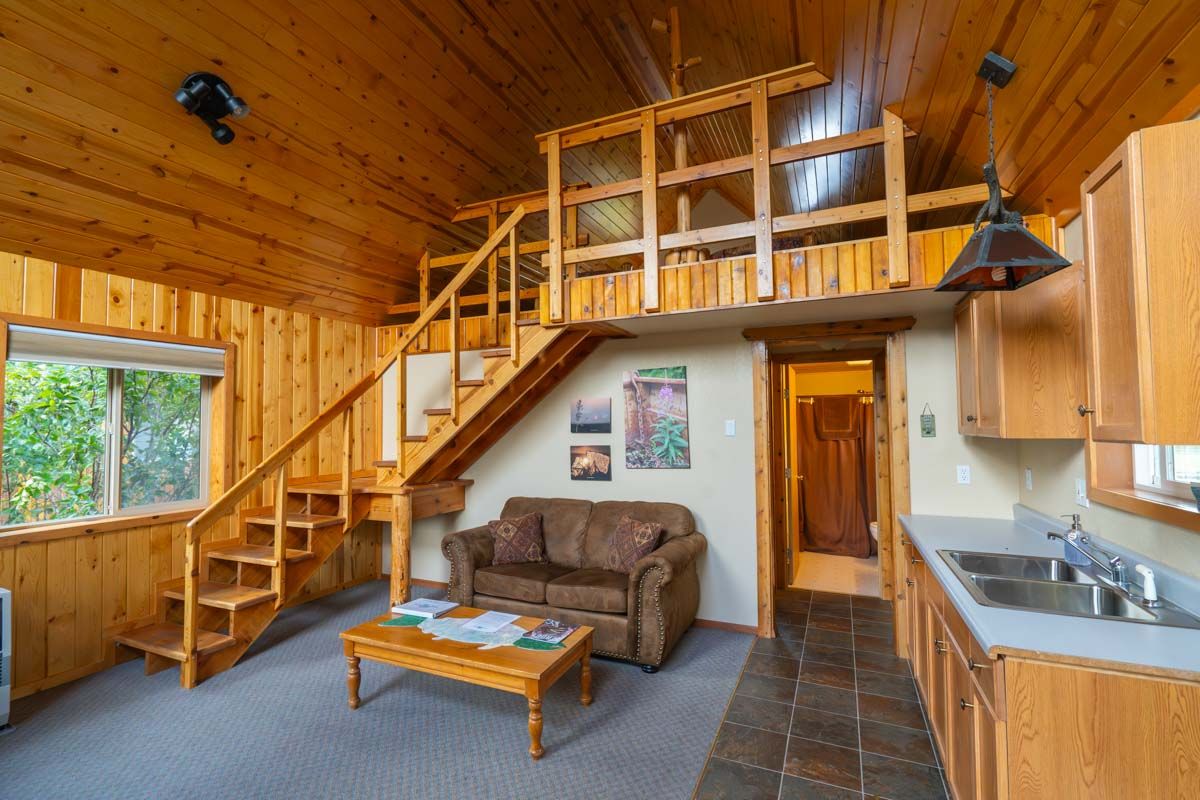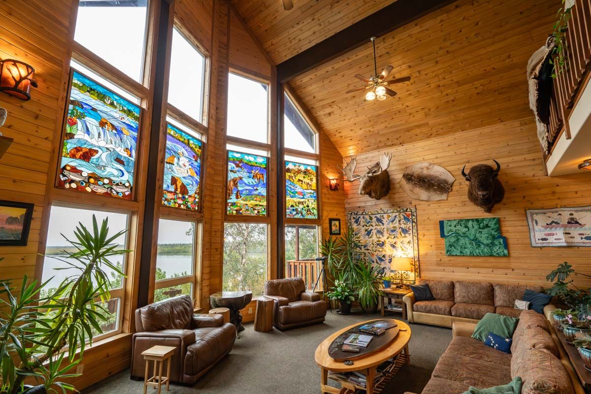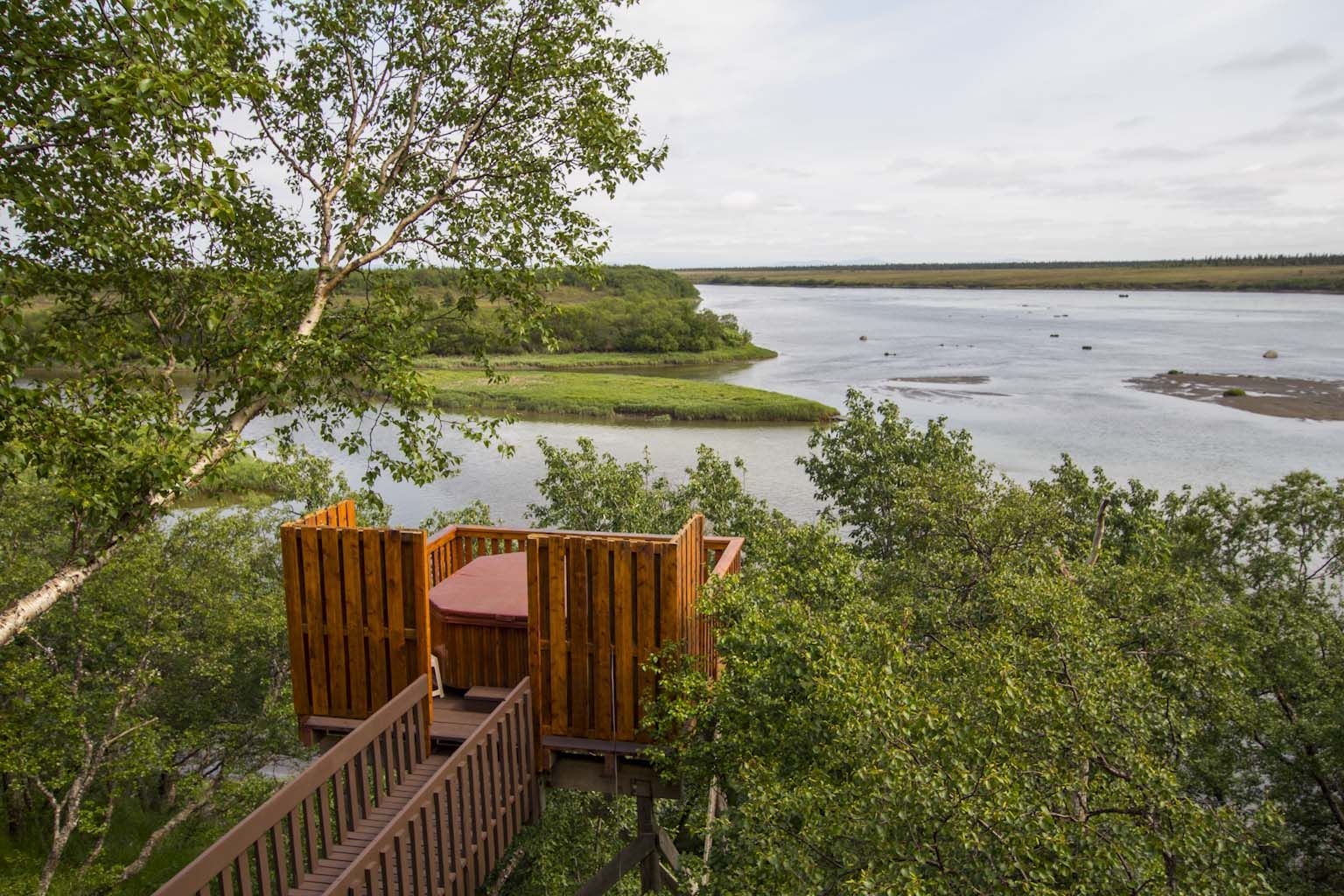 The Bear Trail Lodge consists of a very comfortable and inviting cedar main lodge that is complete with a commercial kitchen, a large dining room, a relaxing living room, a spectacular sun room with decks overlooking the stunning views of the Naknek River and the mountains of Katmai National Park. The guest cabins are well appointed with comfortable beds, private bathrooms, individual heaters, and comfortable couches. Of course all of the rooms have the impressive views of the river. The entire lodge is connected by a boardwalk which will lead you to a dramatic deck with a hot tub that is elevated 70 feet above the river and provides guests with the opportunity to relax while reflecting on the adventures of the day.