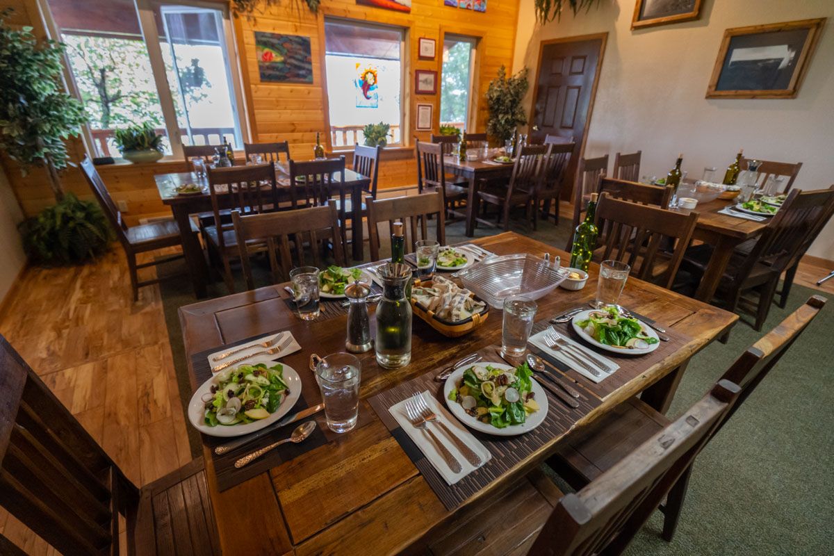 The lodge culinary staff will prepare three hearty meals each day. Breakfast and lunch are served home style and are all-you-can-eat. Dinner is served formally with 3 or 4 courses each evening. Breakfast includes hot and cold cereals, muffins, breads, fruits, eggs, French toast, pancakes, bacon, sausage, reindeer sausage, juices, and coffee. The lunch usually consists of sandwiches and soups. A shore lunch can be arranged with your guide and adds a nice experience on a nice day. Dinner menus include Alaskan style appetizers, NY Strips, prime rib, crab legs, fresh salmon, halibut, shrimp, chicken, and pork. Complimentary beer and bottled wine is also served. Delicious desserts complete the meal.